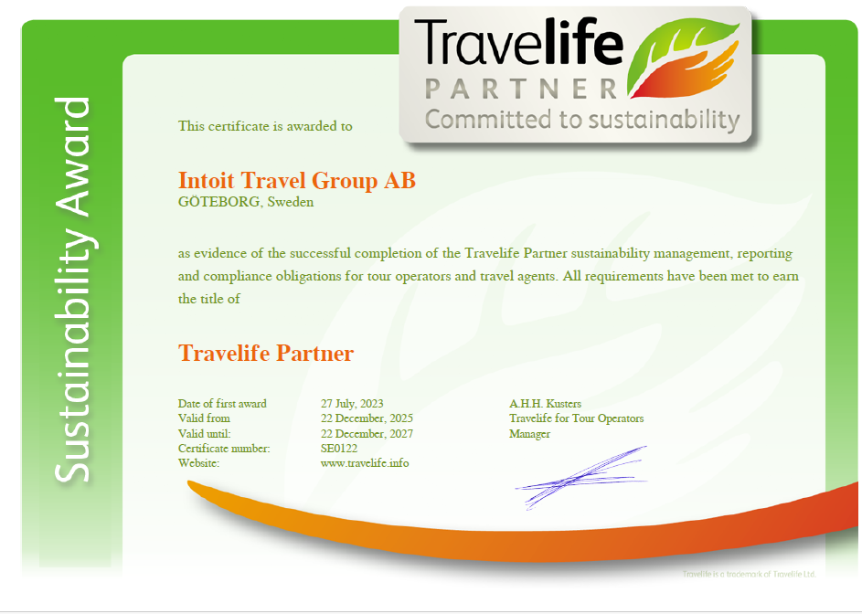 Outside Travels har genom sitt miljö- och hållbarhetsarbete kvalificerat sig för The Travelife Partner Award. Det innebär att vi uppfyller mer än 100 kriterier relaterade till hållbarhetshantering, kontorsverksamhet, samarbete med leverantörer och kundkommunikation. Kvalificeringen påbörjades 2023 och följer ett program med åtgärdspunkter inom såväl social som miljömässig hållbarhet. För att kvalificera sig som Travelife Partner så sker en oberoende revision löpande. Arbetet är fortlöpande där fortsatta förbättringar krävs för att behålla sin Travelife Partner status.
